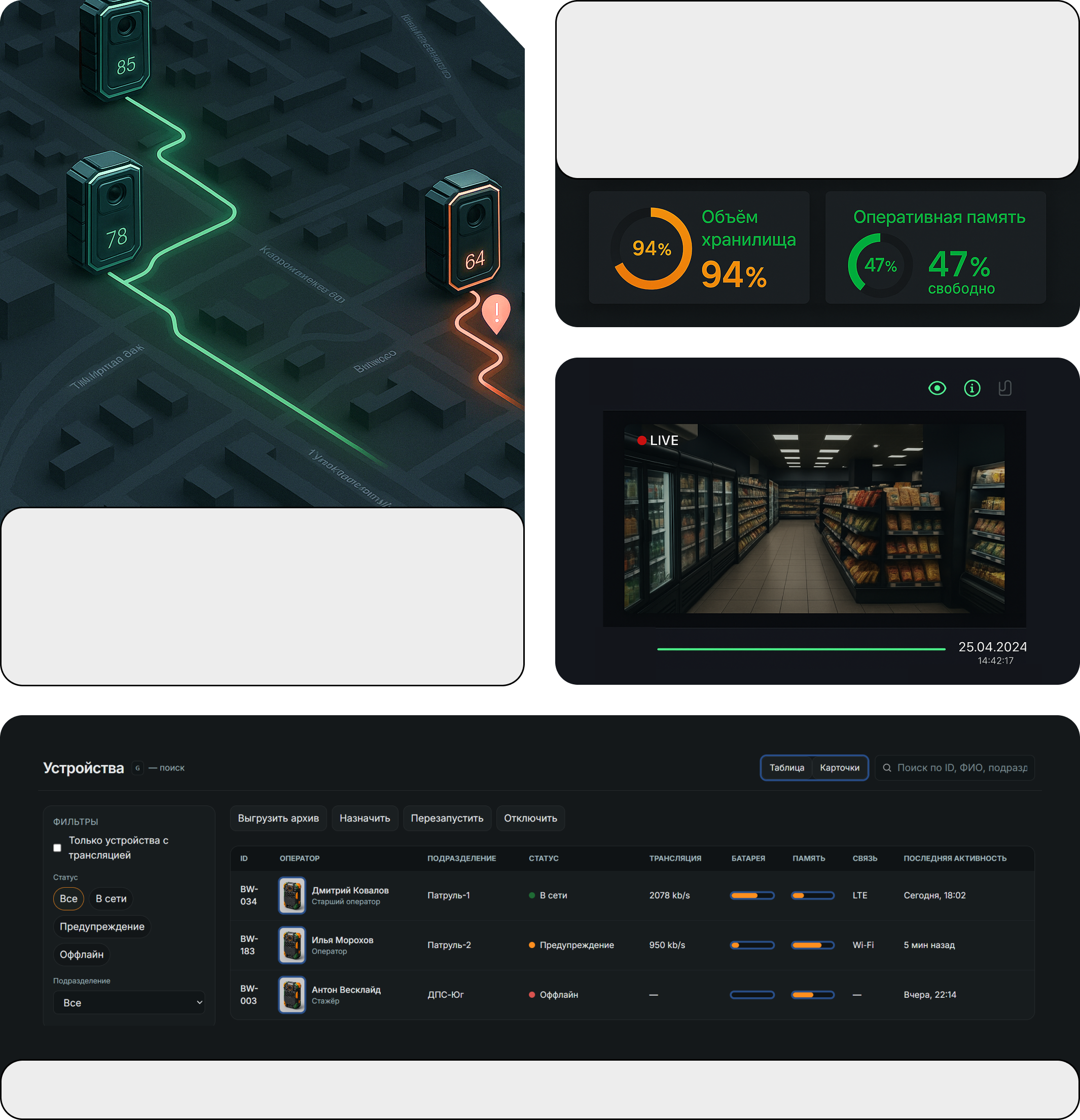 Карта устройств, тревоги, ролевая модель пользователей, статусы батареи, памяти и еще десятки функций